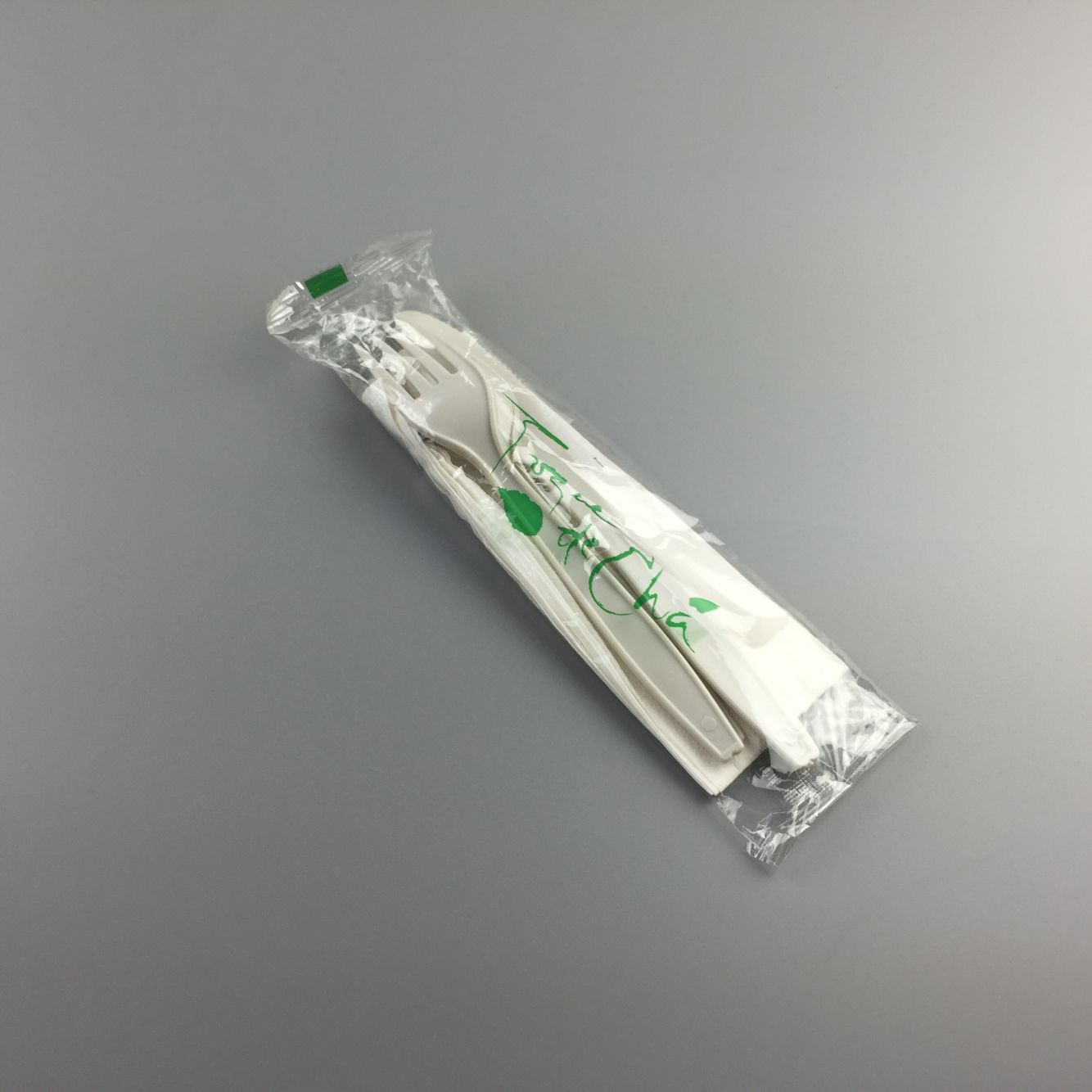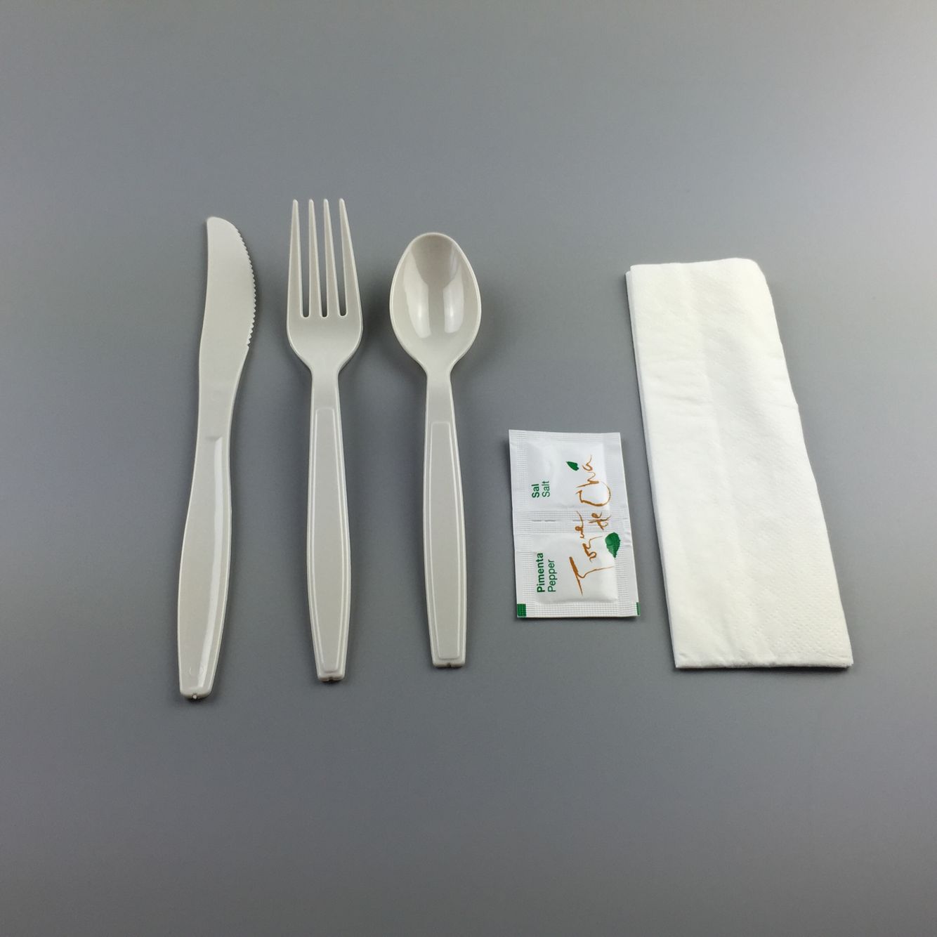 Cutlery Material:PS Size: knife 19.8cm/7.3g;fork 18cm,/7.3g;spoon 16.5cm/5.8g; Salt&pepper:7*4cm,salt/1g+pepper/0.1g; Napkin:33*33cm,16gsm/ply,2plys; Printing color&logo:as per requirement Packing: transparent plastic film or paper bag MOQ: 500000-1000000